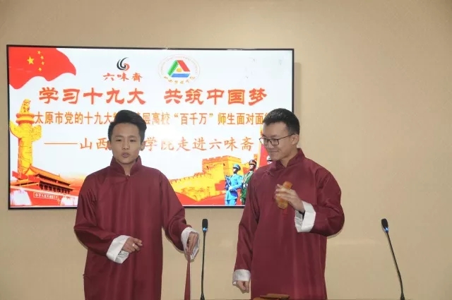 12月22日下午,我院党的十九大精神进基层高校“百千万”师生面对面行动宣讲实践小分队走进太原六味斋实业有限公司。由我院思政部党支部书记卢向群和播音主持学院学生组成的宣讲实践小分队,采取理论宣讲结合文艺宣传的形式作了题为《党的十九大开启我们的新航程》的主题宣讲。太原六味斋实业有限公司党总支书记齐桂珍、组织委员张志华、党办主任林谦、副总经理罗秀花、牛晓峰及全体员工参加了此次宣讲活动。