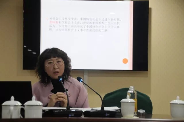 卢向群老师为大家梳理了党的十九大报告中出现的“关键词”并让大家用一个字来形容学习党的十九大精神的感受,与会的领导和员工纷纷说出自己的见解,一个“新”字得到了大家一致认同。卢老师就以“新”字来阐述党的十九大的精神,分享自己学习党的十九大精神的心得体会。她从牢牢把握新时代这条主线、新时代产生新判断、新时代开启新征程、新时代呼唤新理论四个方面来解读党的十九大,悉数近年来党和国家事业取得的巨大成就,她讲到党的十八大以来的五年,也是砥砺奋进的五年,是党和国家发展进程中极不平凡的五年。“中华民族迎来了从站起来、富起来到强起来的伟大飞跃,迎来了中华民族伟大复兴的光明前景。”卢向群老师从多角度诠释了进入新时代的重大意义。为了让大家更清楚地了解到习近平新时代中国特色社会主义思想的基本内涵和基本方略,她提出要深刻认识“八个明确”和“十四个坚持”。在讲到“不忘初心、牢记使命”时,卢老师唱起了陕北民歌《东方红》,生动地向大家阐述了共产党人的初心--为中国人民谋幸福,为中华民族谋复兴,以永不懈怠的精神状态和一往无前的奋斗姿态奋勇前行。