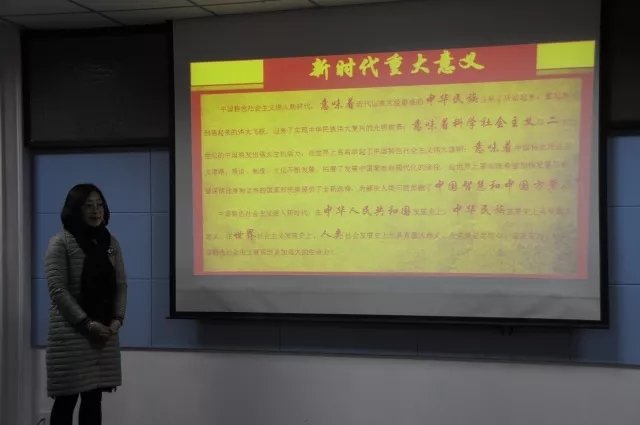 张红梅老师条理清晰地对党的十九大报告进行了梳理,重点解读了习近平新时代中国特色社会主义思想,从我国的经济建设、精神文化发展模式、生态环境、强军兴军、民生保障等方面阐述了党的十八大以来取得的历史和工作成就,诠释我国进入中国特色社会主义“新时代”的这一重大政治判断的具体意义,以及“新时代”社会主要矛盾的基本内涵等。她指出,党的十九大报告内容丰富、博大精深,做出了中国特色社会主义进入了新时代的重大判断,提出了习近平新时代中国特色社会主义思想,确定了新时代的新目标新任务,为党和人民事业发展进步指明了前进方向。党的十九大报告与大家关系密切,要进一步深入学习习近平新时代中国特色社会主义思想,深刻理解“八个明确”“十四个坚持”,解决主要矛盾,全面推进依法治国。