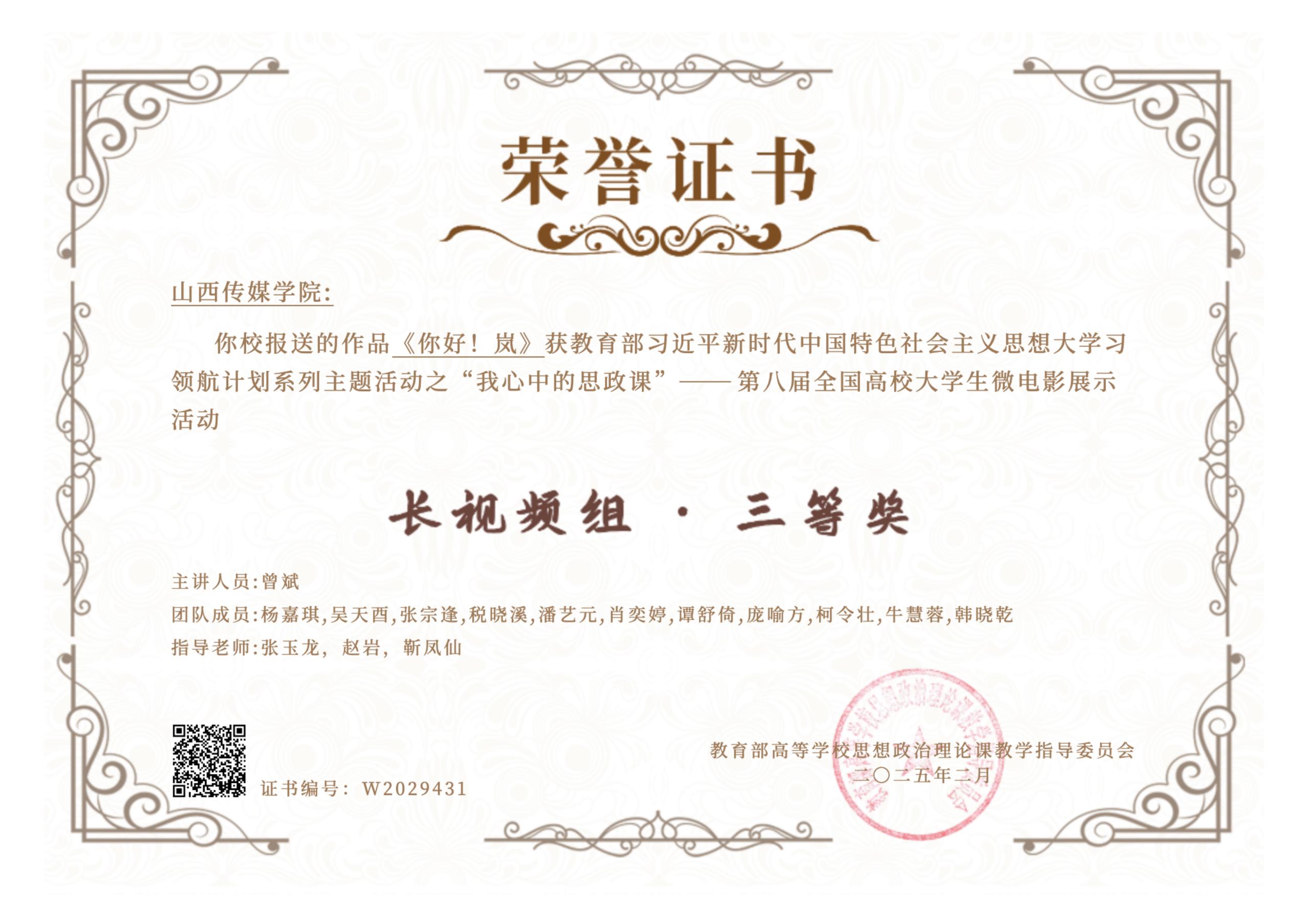 近日,由教育部高校思想政治理论课教学指导委员会主办的“我心中的思政课”--第八届全国高校大学生微电影展示活动评审结果正式揭晓。本届活动共收到1006所高校提交的3134部微电影作品,共评选出获奖作品366项。其中长视频组312项。我校选送作品《你好!岚》荣获长视频组三等奖。