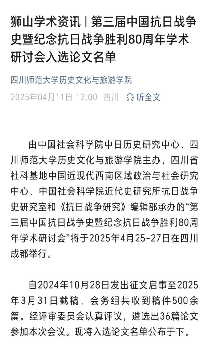 2025年是世界反法西斯战争暨中国人民抗日战争胜利80周年。4月25—27日,中国社会科学院中日历史研究中心、四川师范大学主办的第三届中国抗日战争史暨纪念抗日战争胜利80周年学术研讨会在四川成都举办。
